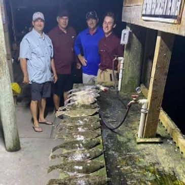 Trips depart at sunset until limited-out or the customer is ready to head-in. Max people on the boat is 4 people plus the captain. Limit is 5 flounder per person that are larger than 15″. If you have any questions, call Beverly (Captain’s Aerich’s grandma) and she’ll be happy to confirm your reservation date and answer your questions!